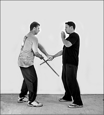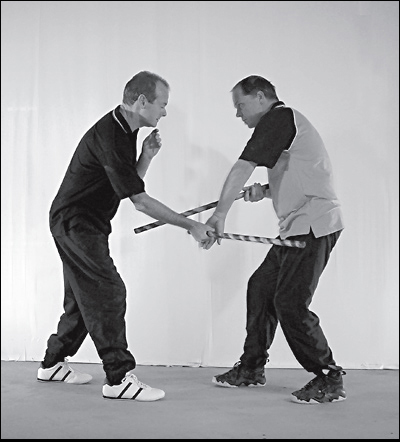 The ‘Down’ blocks can be to the left or the right. The blocks move forward and across the front of the lower body, in a forceful sweeping motion for protection. With a fighter holding their stick in the right hand the block to the left can be called the ‘Forehand Down Block’ and the block to the right can be called the ‘Backhand Down Block’. The emptyhand in either block, can be at the front or back of the weapon.